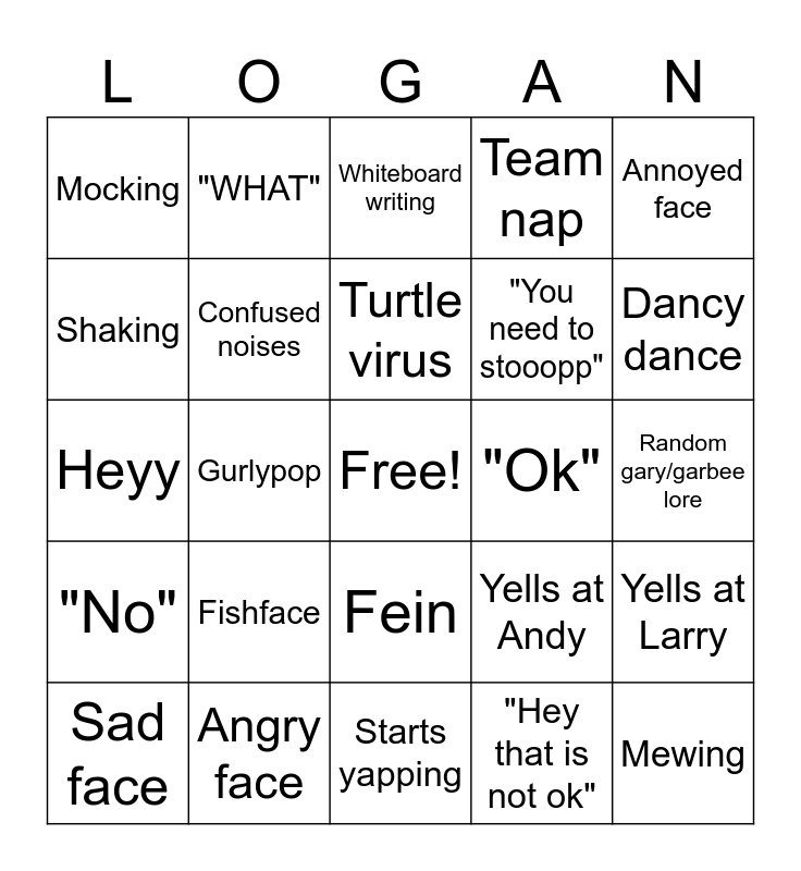 This bingo card has a free space and 24 words: Fishface, Angry face, Turtle virus, Sad face, Annoyed face, Mocking, Shaking, "WHAT", "Ok", Fein, "You need to stooopp", Heyy, Yells at Andy, Yells at Larry, Confused noises, "Hey that is not ok", Random gary/garbee lore, Whiteboard writing, Dancy dance, Gurlypop, Mewing, "No", Team nap and Starts yapping.
