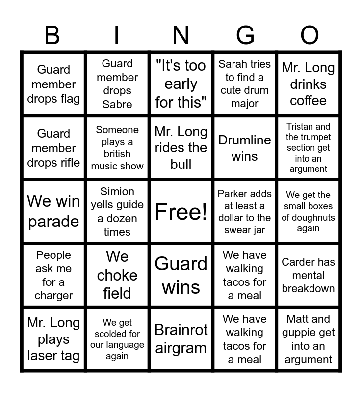 This bingo card has a free space and 25 words: We choke field, Brainrot airgram, Mr. Long rides the bull, Mr. Long plays laser tag, Mr. Long drinks coffee, Guard member drops flag, Guard member drops rifle, Guard member drops Sabre, Parker adds at least a dollar to the swear jar, Guard wins, Drumline wins, We win parade, We have walking tacos for a meal, Carder has mental breakdown, Someone plays a british music show, Superhero show, We get the small boxes of doughnuts again, "It's too early for this", Tristan and the trumpet section get into an argument, Simion yells guide a dozen times, Matt and guppie get into an argument, We get scolded for our language again, People ask me for a charger, Sarah tries to find a cute drum major and We have walking tacos for a meal.