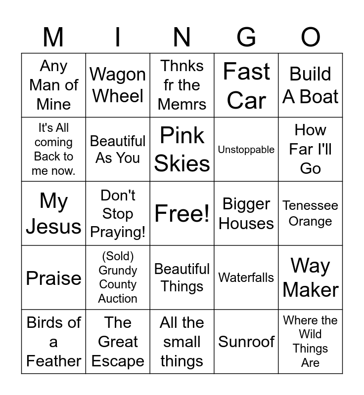 This bingo card has a free space and 39 words: Ain't No Love In Oklahoma, Cowboys Cry Too, A Guy for that, Beautiful As You, Birds of a Feather, Beautiful Things, Pink Skies, Darlin', Build A Boat, Praise, Don't Stop Praying!, Fast Car, Where the Wild Things Are, Tenessee Orange, Bigger Houses, (Sold) Grundy County Auction, She's in love with the boy, Any Man of Mine, Bye Bye Bye, Waterfalls, It's All coming Back to me now., All the small things, Unstoppable, How Far I'll Go, Part of Your World, Riptide, I like to move it, Cowgirls, One Man Band, Wagon Wheel, Cruel Summer, 22, Thnks fr the Memrs, The Great Escape, Sunroof, Hakuna Matata, Way Maker, My Jesus and Counting My Blessings.