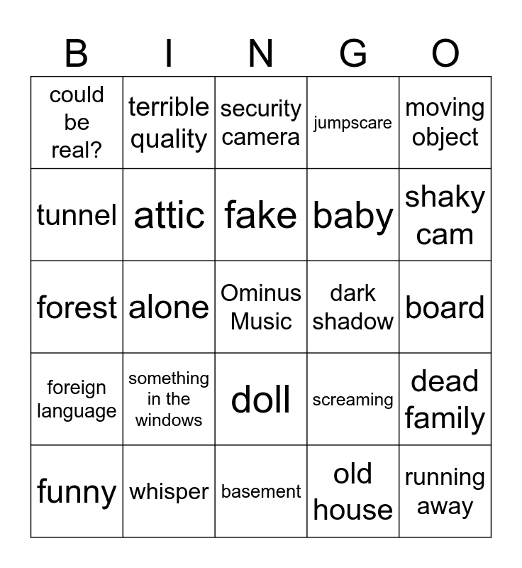 This bingo card has a free space and 24 words: something in the windows, whisper, fake, funny, moving object, could be real?, tunnel, terrible quality, dark shadow, doll, baby, forest, screaming, dead family, attic, old house, board, security camera, shaky cam, alone, running away, foreign language, jumpscare and basement.