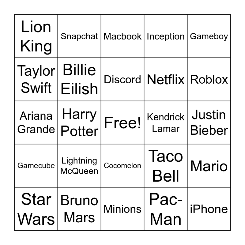 This bingo card has a free space and 41 words: Among Us, Ariana Grande, Avengers, Billie Eilish, Bruno Mars, Cocomelon, Discord, Fortnite, Gameboy, Gamecube, Harry Potter, Inception, iPhone, Justin Bieber, Kendrick Lamar, Lightning McQueen, Lil Nas X, Lion King, M83, Macbook, Mario, Minecraft, Minions, Netflix, Nyan Cat, Olivia Rodrigo, Pac-Man, Post Malone, Roblox, Sabrina Carpenter, Smash Bros, Snapchat, Star Wars, Switch, Taco Bell, Taylor Swift, The Weeknd, TikTok, WhatsApp, Wii and Windows.