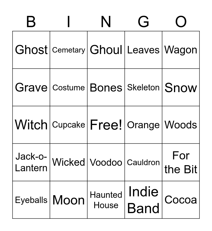 This bingo card has a free space and 56 words: Pumpkin Spice, Eyeballs, Cider, Ghost, Haunted House, Candy, Costume, Harvest, Skeleton, Spooky, Leaves, Straw, Syrup, Flu, Thriller, Smore, Wagon, Cupcake, Hay, Cocoa, Orange, Broom, Cauldron, Ghoul, Turkey, Bones, Apple, Treat, Snow, Haunted Mansion, Vampire, Twilight, Autumn, Cozy, Woods, Grave, Witch, Zombie, Jack-o-Lantern, Cemetary, Voodoo, Hoodie, Spell, Wheat, Hocus Pocus, Wicked, Moon, Maze, Scooby Doo, Welcome Back, Indie Band, Jello, Pickle, Dog, For the Bit and Faceoff.