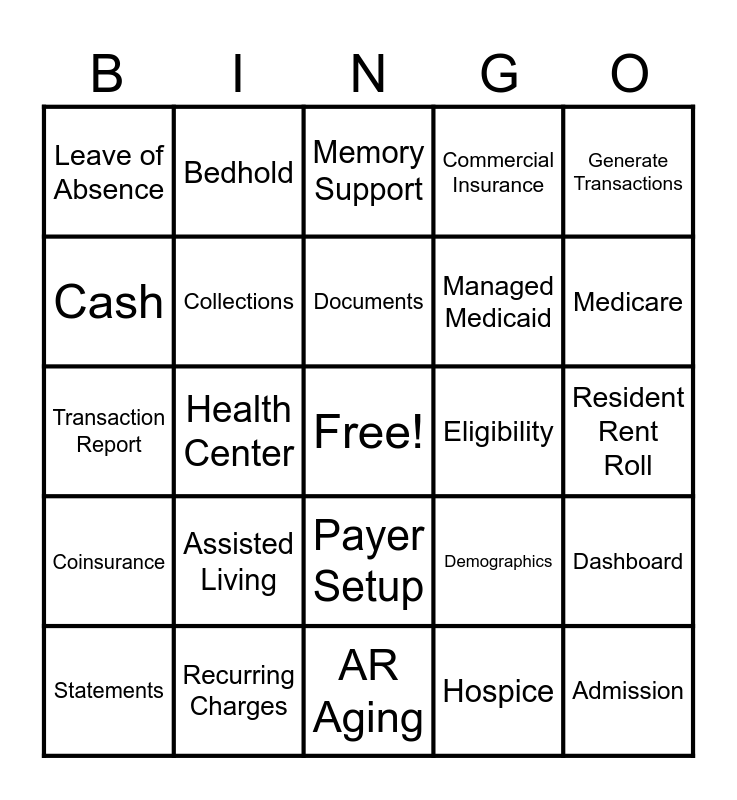 This bingo card has a free space and 50 words: Adjustments, Admission, Ancillaries, AR Aging, Assisted Living, Authorization, Bedhold, Care Level, Cash, Census, Collections, Commercial Insurance, Dashboard, Demographics, Detailed Census, Discharge, Documents, Eligibility, External Facilities, Generate Transactions, Health Center, Hospice, Leave of Absence, Managed Medicaid, Medicaid, Medical Professionals, Medicare, Medicare Advantage, Memory Support, Payer Setup, PCC, Private Contract, Private Non Contract, Patient Liability, Recurring Charges, Redwood Terrace, Regents Point, Resident EFT Setup, Resident Ledger, Resident Rent Roll, Residential Living, Responsible Party, Royal Oaks, Service Package, Statements, Transaction Report, Transfer to Hospital, Westminster Gardens, Coinsurance and Medicaid Pending.