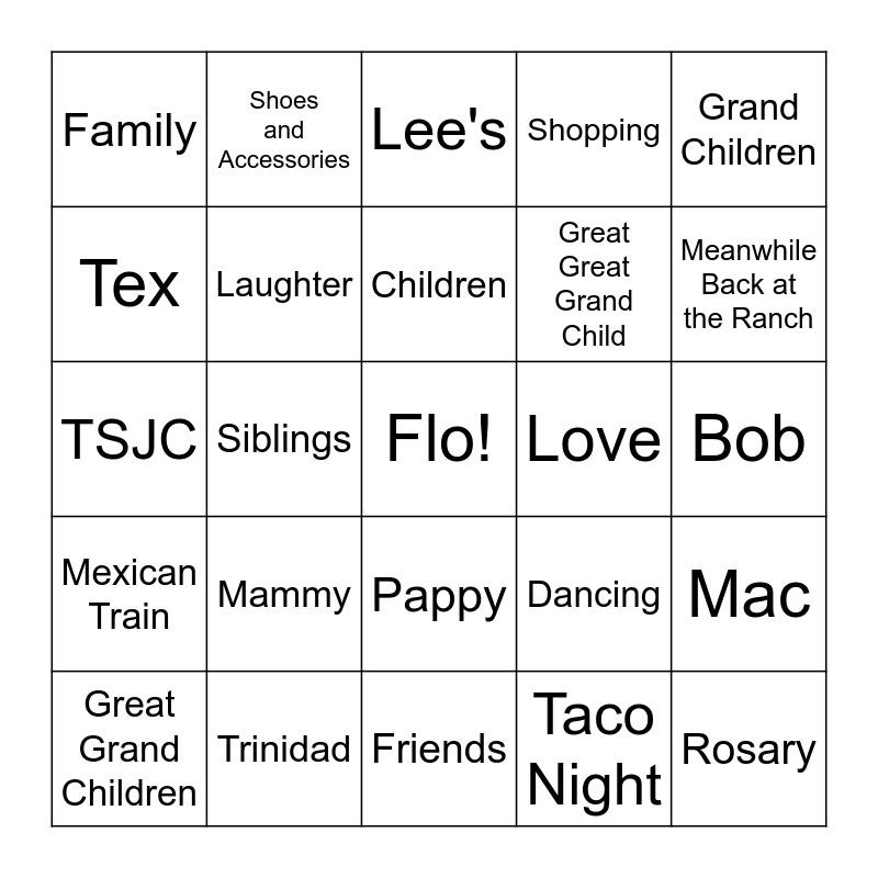 This bingo card has a free space and 24 words: Mammy, Trinidad, Children, Great Grand Children, Grand Children, Family, Tex, Shoes and Accessories, Love, Pappy, Great Great Grand Child, TSJC, Dancing, Mac, Laughter, Taco Night, Bob, Lee's, Meanwhile Back at the Ranch, Siblings, Rosary, Mexican Train, Shopping and Friends.