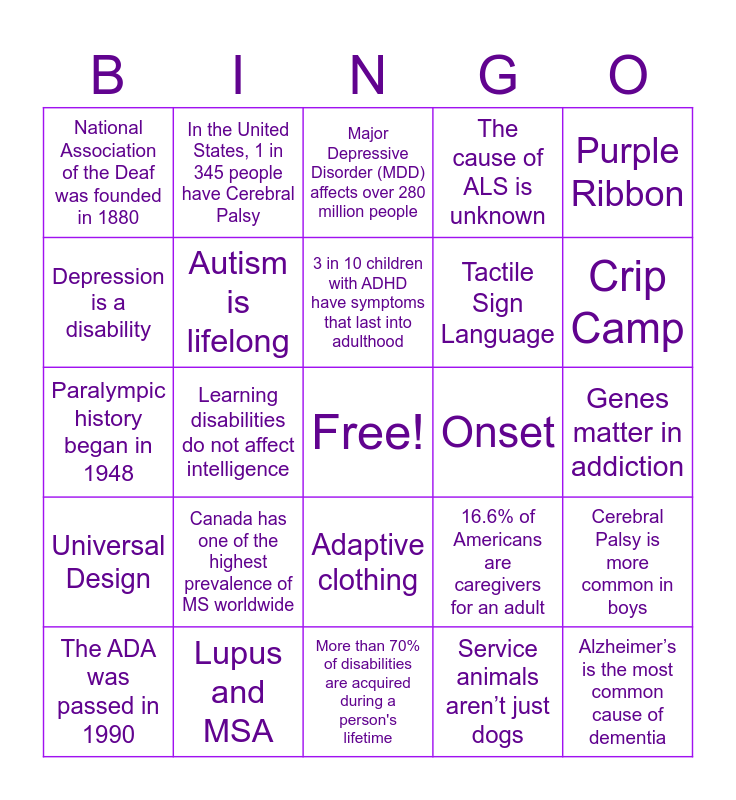 This bingo card has a free space and 29 words: The ADA was passed in 1990, 5% of the world's population has hearing loss, Learning disabilities do not affect intelligence, Bipolar disease is often misdiagnosed as depression, National Association of the Deaf was founded in 1880, Major Depressive Disorder (MDD) affects over 280 million people, Autism is lifelong, Canada has one of the highest prevalence of MS worldwide, Onset, Lupus and MSA, Genes matter in addiction, Alzheimer’s is the most common cause of dementia, More than 70% of disabilities are acquired during a person's lifetime, Service animals aren’t just dogs, Crip Camp, Hors normes, Adaptive clothing, Universal Design, Purple Ribbon, Paralympic history began in 1948, 16.6% of Americans are caregivers for an adult, Accessible voting, Tactile Sign Language, Depression is a disability, The cause of ALS is unknown, In the United States, 1 in 345 people have Cerebral Palsy, Cerebral Palsy is more common in boys, 3 in 10 children with ADHD have symptoms that last into adulthood and Most Adults Who Have ADHD Don’t Know It.
