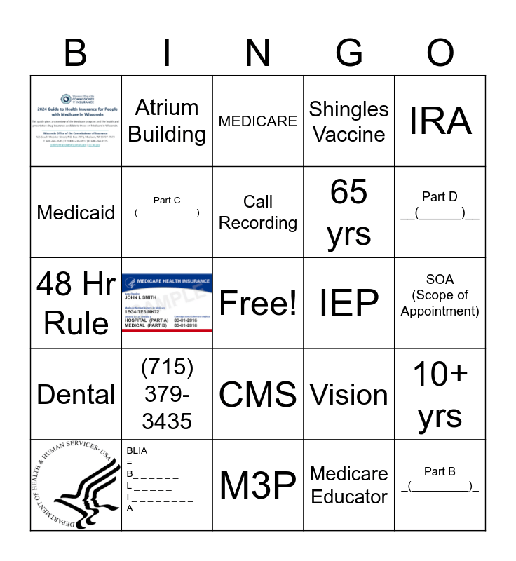 This bingo card has 5 images, a free space and 24 words: MEDICARE, Part C _(___________)_, (715) 379-3435, IEP, BLIA = B_ _ _ _ _ _ L _ _ _ _ _ I _ _ _ _ _ _ _ _ A _ _ _ _ _, SOA (Scope of Appointment), Part B _(_________)_, M3P, Medicare Educator, Part D __(______)__, $2,000, CMS, Dental, IRA, 48 Hr Rule, Vision, Part A __(____________)__, 65 yrs, Medicaid, Shingles Vaccine, Atrium Building, 10+ yrs, Call Recording and AEP.
