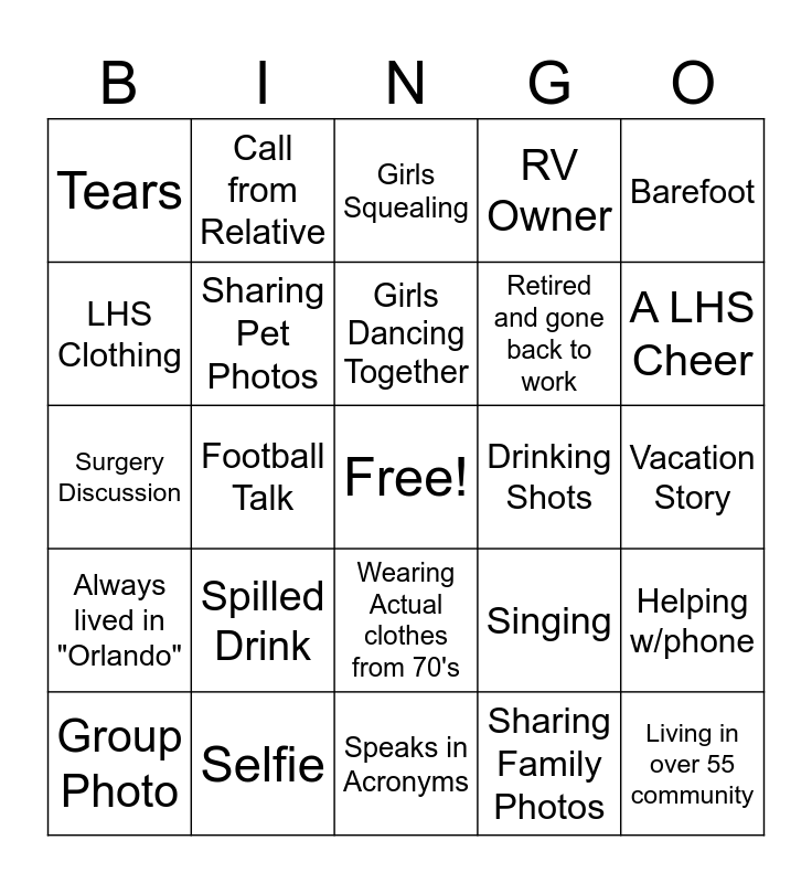 This bingo card has a free space and 24 words: Spilled Drink, Selfie, Girls Dancing Together, Group Photo, Barefoot, Tears, LHS Clothing, Call from Relative, Drinking Shots, Wearing Actual clothes from 70's, Retired and gone back to work, Surgery Discussion, Singing, Helping w/phone, Sharing Pet Photos, Sharing Family Photos, Vacation Story, Girls Squealing, A LHS Cheer, Football Talk, Living in over 55 community, Always lived in "Orlando", RV Owner and Speaks in Acronyms.