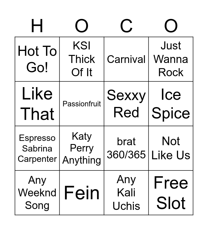 This bingo card has 16 words: Fein, Not Like Us, Carnival, Hot To Go!, Espresso Sabrina Carpenter, KSI Thick Of It, brat 360/365, Any Kali Uchis, Like That, Passionfruit, Any Weeknd Song, Just Wanna Rock, Katy Perry Anything, Ice Spice, Sexxy Red and Free Slot.