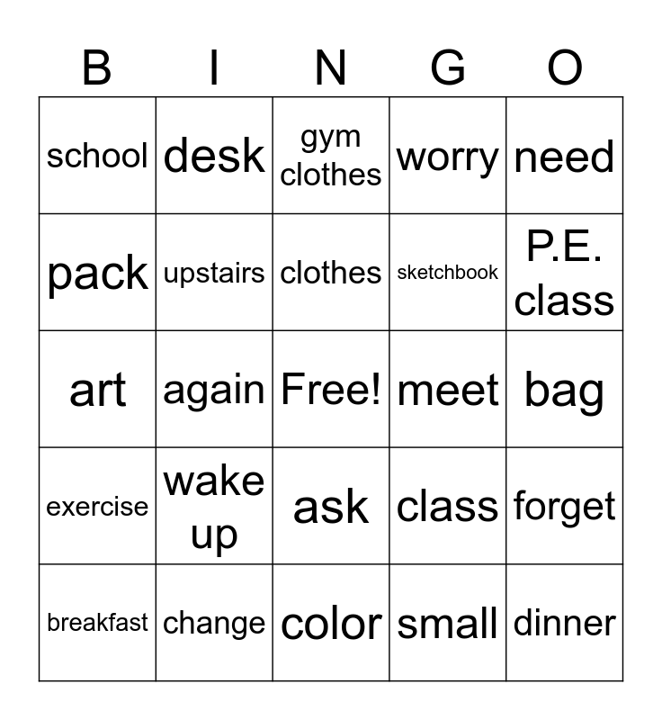 This bingo card has a free space and 24 words: wake up, change, clothes, breakfast, need, school, pack, desk, meet, ask, sketchbook, art, class, forget, upstairs, small, bag, gym clothes, P.E. class, again, dinner, exercise, worry and color.