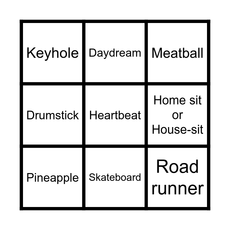 This bingo card has a free space and 40 words: Goldfish, Wall flower, Bullfrog, Pineapple, Car wash, Seafood, Skateboard, Rain jacket, Road runner, Blackboard, Homesick, Drumstick, Basketball, Jellybean, Jellyfish, Flashback, Bus stop, Keyhole, Hotdog, Meatball, Candy Cane, Cupcake, Honeycomb, Home sit or House-sit, Ladybug, Watermelon, Water tank, Windmill, Toothbrush, Grapefruit, Waterfall, Hair cut, Peanut butter, Greenhouse, Popcorn, Armchair, Brainstorm, Lighthouse, Daydream and Wallpaper.
