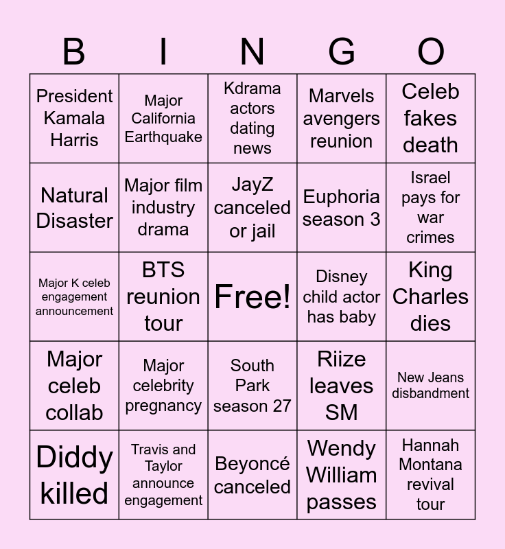 This bingo card has a free space and 24 words: Major celebrity pregnancy, Travis and Taylor announce engagement, JayZ canceled or jail, Diddy killed, Celeb fakes death, President Kamala Harris, Natural Disaster, Major California Earthquake, Disney child actor has baby, South Park season 27, Euphoria season 3, Major K celeb engagement announcement, Riize leaves SM, New Jeans disbandment, Major film industry drama, Wendy William passes, King Charles dies, Kdrama actors dating news, Israel pays for war crimes, BTS reunion tour, Hannah Montana revival tour, Major celeb collab, Marvels avengers reunion and Beyoncé canceled.
