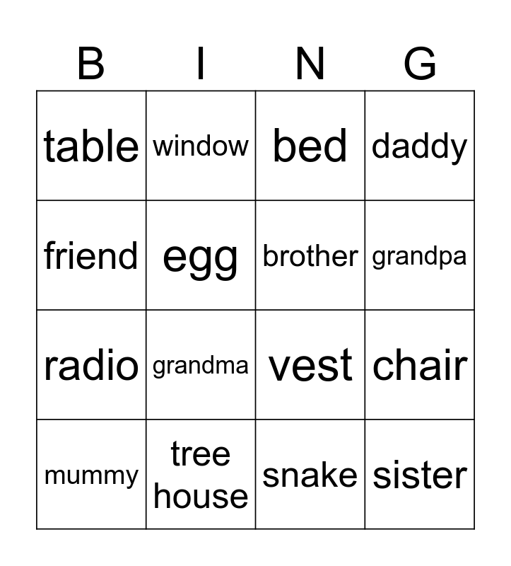 This bingo card has 16 words: tree house, chair, bed, table, radio, window, vest, snake, friend, egg, mummy, daddy, grandma, grandpa, brother and sister.