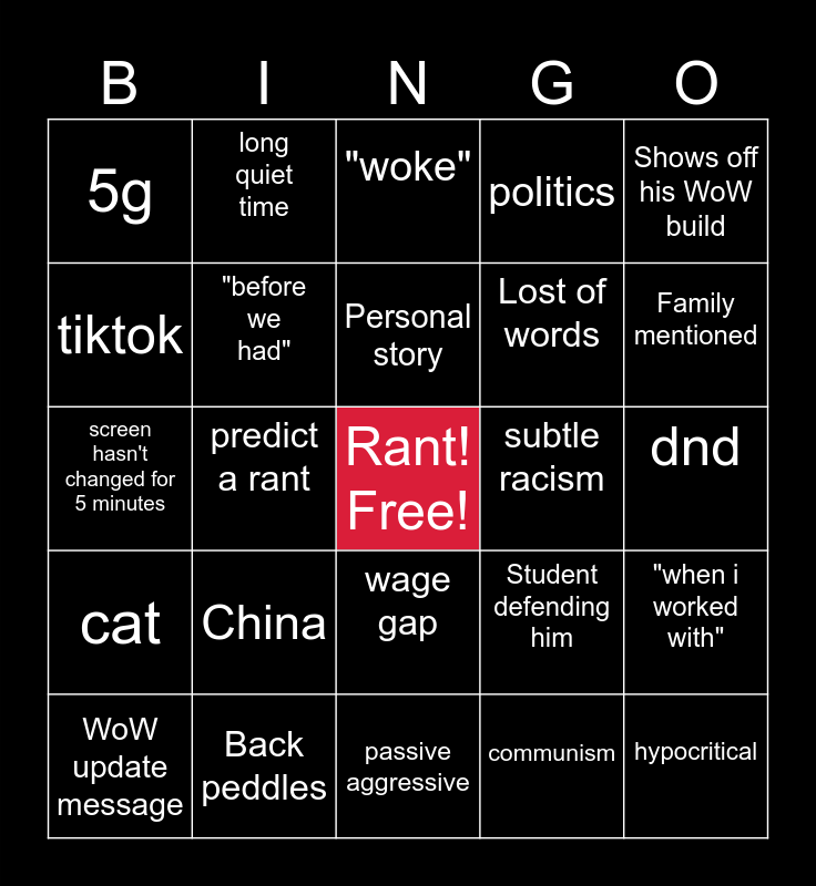 This bingo card has a free space and 24 words: China, Back peddles, Personal story, WoW update message, Shows off his WoW build, 5g, tiktok, long quiet time, subtle racism, wage gap, Lost of words, screen hasn't changed for 5 minutes, Student defending him, "when i worked with", "before we had", communism, dnd, "woke", Family mentioned, predict a rant, hypocritical, cat, politics and passive aggressive.