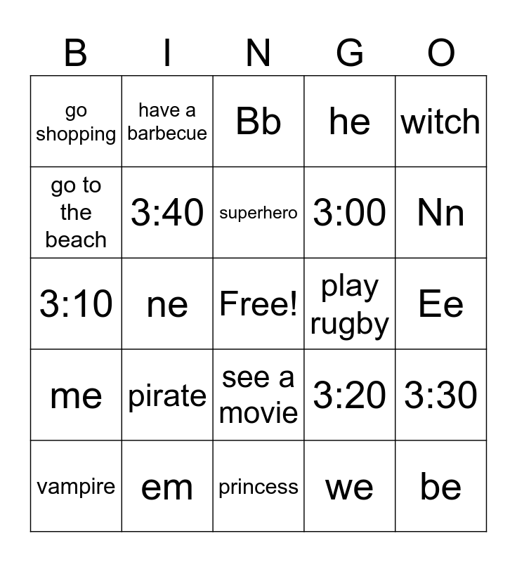 This bingo card has a free space and 25 words: pirate, princess, superhero, vampire, witch, go shopping, go to the beach, have a barbecue, play rugby, see a movie, 3:00, 3:10, 3:20, 3:30, 3:40, 3:50, Ee, Bb, Nn, ne, be, em, me, he and we.