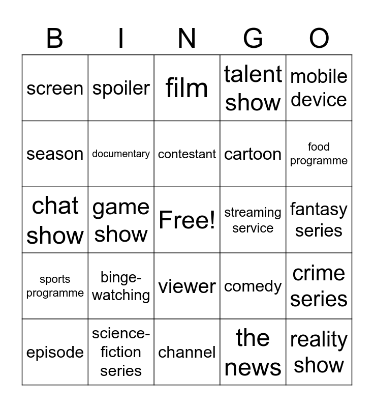 This bingo card has a free space and 25 words: binge-watching, channel, contestant, episode, mobile device, screen, season, spoiler, streaming service, viewer, cartoon, chat show, comedy, crime series, documentary, drama, fantasy series, film, food programme, game show, reality show, science-fiction series, sports programme, talent show and the news.