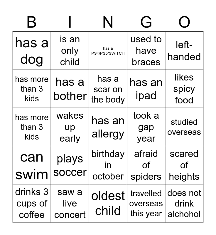 This bingo card has a free space and 24 words: plays soccer, saw a live concert, has a scar on the body, drinks 3 cups of coffee, left-handed, has a dog, has more than 3 kids, is an only child, took a gap year, birthday in october, has an ipad, has more than 3 kids, afraid of spiders, scared of heights, has a bother, travelled overseas this year, studied overseas, has a PS4/PS5/SWITCH, likes spicy food, wakes up early, does not drink alchohol, can swim, used to have braces and oldest child.