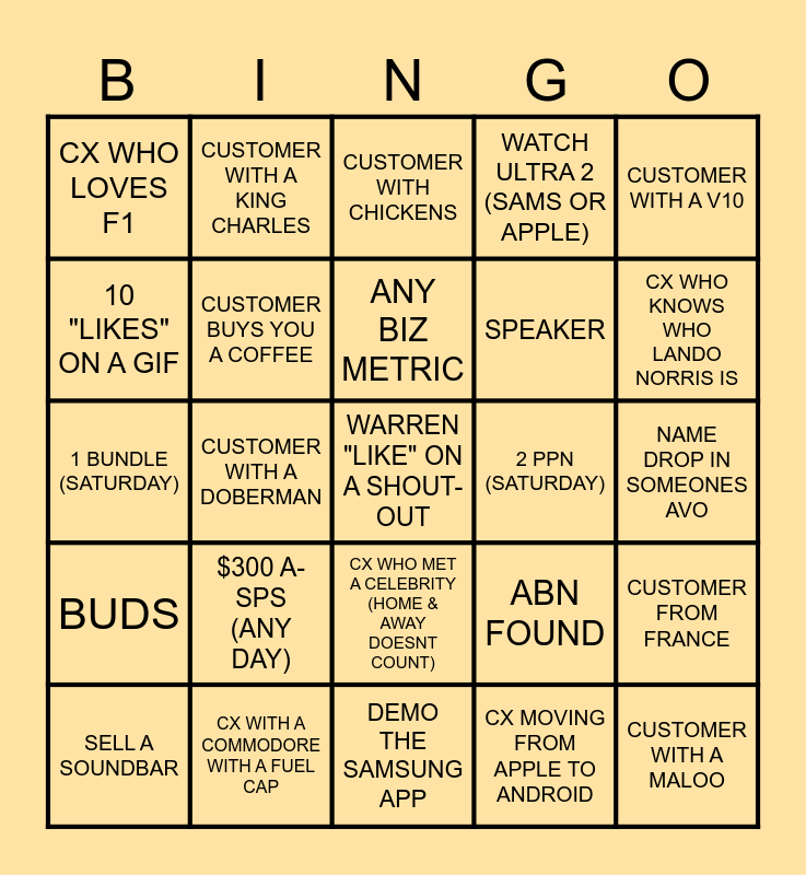 This bingo card has a free space and 24 words: $300 A-SPS (ANY DAY), CX WITH A COMMODORE WITH A FUEL CAP, ANY BIZ METRIC, SELL A SOUNDBAR, CUSTOMER WITH A V10, CX WHO LOVES F1, 10 "LIKES" ON A GIF, CUSTOMER WITH A KING CHARLES, 2 PPN (SATURDAY), CX WHO MET A CELEBRITY (HOME & AWAY DOESNT COUNT), SPEAKER, 1 BUNDLE (SATURDAY), ABN FOUND, CUSTOMER FROM FRANCE, CUSTOMER BUYS YOU A COFFEE, CX MOVING FROM APPLE TO ANDROID, NAME DROP IN SOMEONES AVO, CUSTOMER WITH CHICKENS, CX WHO KNOWS WHO LANDO NORRIS IS, CUSTOMER WITH A DOBERMAN, CUSTOMER WITH A MALOO, BUDS, WATCH ULTRA 2 (SAMS OR APPLE) and DEMO THE SAMSUNG APP.