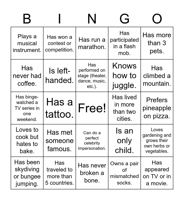 This bingo card has a free space and 30 words: Has traveled to more than 5 countries., Speaks more than three languages., Has a tattoo., Prefers cats over dogs., Plays a musical instrument., Has run a marathon., Is left-handed., Can do a perfect celebrity impersonation., Has lived in more than two cities., Has never broken a bone., Prefers pineapple on pizza., Has appeared on TV or in a movie., Owns a pair of mismatched socks., Has been to a concert in the last month., Has climbed a mountain., Can recite a poem from memory., Is an only child., Loves to cook but hates to bake., Has met someone famous., Has more than 3 pets., Has binge-watched a TV series in one weekend., Can whistle using two fingers., Has won a contest or competition., Knows how to juggle., Has never had coffee., Has participated in a flash mob., Loves gardening and grows their own herbs or vegetables., Has been skydiving or bungee jumping., Has performed on stage (theater, dance, music, etc.). and Has written and published a blog or article..