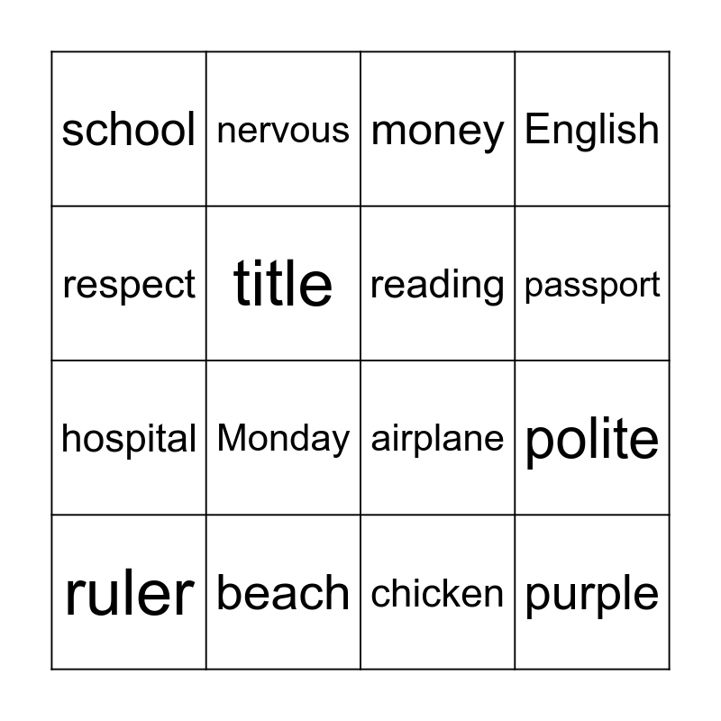 This bingo card has 16 words: beach, polite, money, school, hospital, nervous, airplane, chicken, respect, title, ruler, English, Monday, passport, reading and purple.