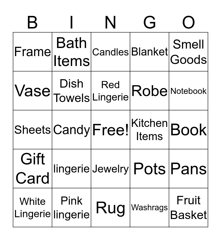 This bingo card has a free space and 24 words: lingerie, Pink lingerie, Red Lingerie, White Lingerie, Smell Goods, Frame, Vase, Bath Items, Kitchen Items, Jewelry, Robe, Sheets, Pots, Pans, Dish Towels, Washrags, Book, Candles, Notebook, Candy, Fruit Basket, Gift Card, Blanket and Rug.