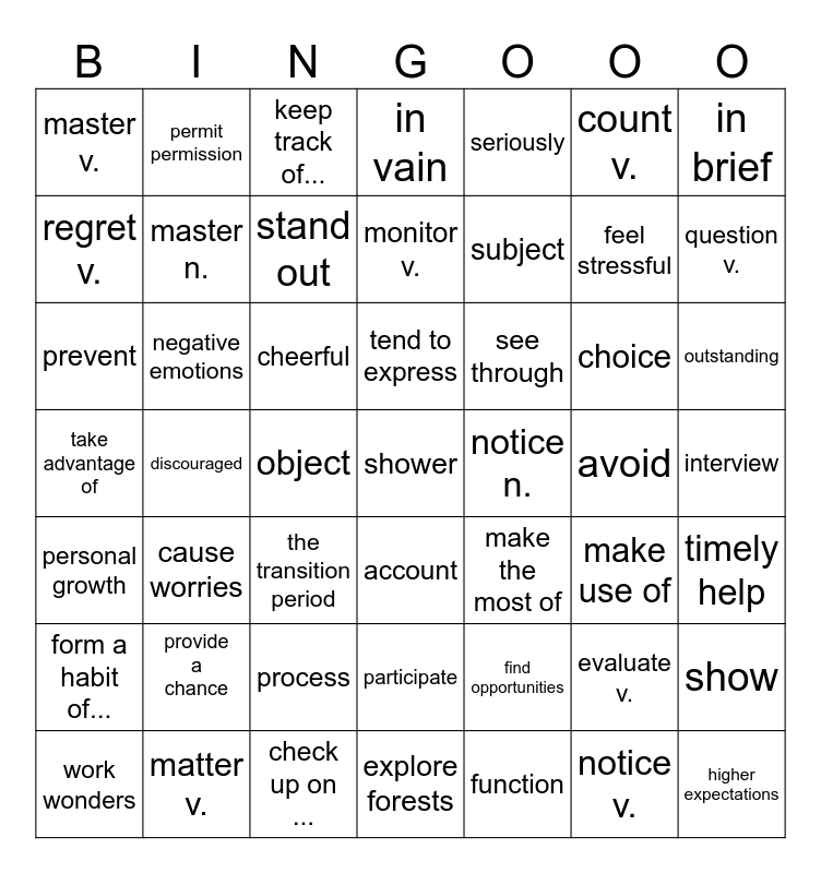 This bingo card has a free space and 48 words: find opportunities, feel stressful, explore forests, discouraged, cheerful, interview, permit permission, matter v., count v., account, in brief, in vain, choice, see through, form a habit of..., avoid, regret v., question v., evaluate v., seriously, subject, object, master v., master n., show, stand out, outstanding, work wonders, tend to express, negative emotions, notice v., notice n., timely help, provide a chance, take advantage of, make the most of, make use of, prevent, the transition period, process, personal growth, higher expectations, keep track of..., check up on ..., monitor v., participate, cause worries and function.