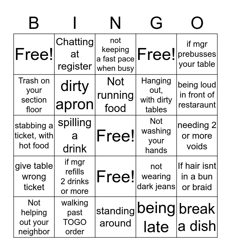 This bingo card has a free space and 24 words: if mgr refills 2 drinks or more, walking past TOGO order, Not running food, Not helping out your neighbor, if mgr prebusses your table, Free!, Trash on your section floor, Chatting at register, Not washing your hands, Free!, Hanging out, with dirty tables, stabbing a ticket, with hot food, not wearing dark jeans, If hair isnt in a bun or braid, dirty apron, being late, needing 2 or more voids, not keeping a fast pace when busy, being loud in front of restaraunt, spilling a drink, break a dish, give table wrong ticket, Free! and standing around.