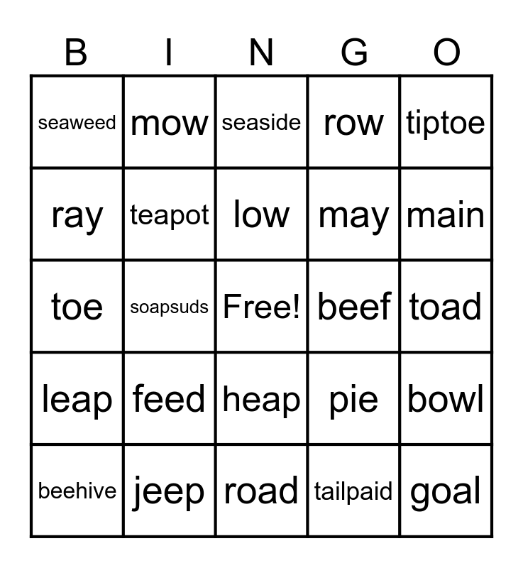 This bingo card has a free space and 29 words: beehive, coatrack, soapsuds, sailboat, seaweed, seaside, teapot, feed, beef, jeep, toad, goal, road, tailpaid, main, seam, heap, leap, tiptoe, toe, pie, tie, may, ray, row, mow, bowl, low and rowboat.
