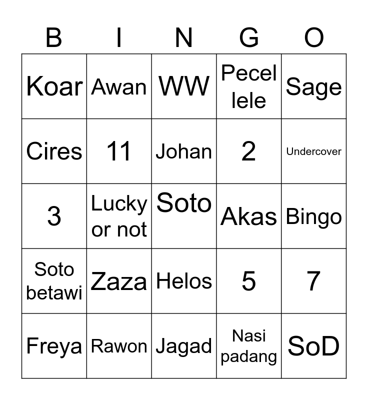 This bingo card has 25 words: Zaza, Jagad, Johan, Freya, Sage, Koar, Cires, Awan, Akas, Helos, 2, 3, 5, 7, 11, SoD, Bingo, WW, Undercover, Lucky or not, Soto, Rawon, Soto betawi, Pecel lele and Nasi padang.