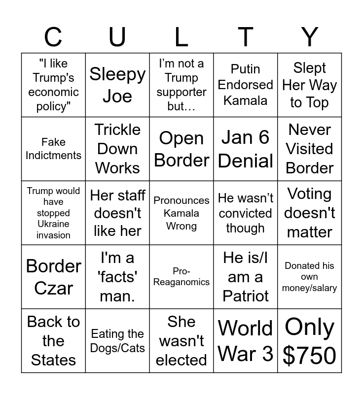 This bingo card has a free space and 59 words: Drill Baby Drill!, Eating the Dogs/Cats, Largest Deportation Operation in American History, Border Czar, World War 3, Transphobia, Trickle Down Works, Openly Admits Misogyny, Jan 6 Denial, Aurora, CO, Putin Endorsed Kamala, Christian Nationalism, Fake Indictments, End inflation, Seal the Border, "I like Trump's economic policy", Only $750, Slept Her Way to Top, Migrant Crime Epidemic, Open Border, He wasn’t convicted though, I’m not a Trump supporter but…, Back to the States, Donated his own money/salary, Take Care of Our Own First, He’s for the people, Wants Social Programs, is antiSocialism, Where Is Biden?, Never Visited Border, Build the Wall, He doesn't support Project 2025!, Hasn't read Agenda 47, The real criminal is Harris, I'm an independent [Spews MAGA], Sleepy Joe, She's a communist!, Withdrawal from Afghanistan, Her staff doesn't like her, In office for 4 years, what has she done?, Trump would have stopped Ukraine invasion, The data is cooked, I'm a 'facts' man., Voting doesn't matter, Man with AB opinion, He supports our troops, Stolen Valor, Venezuela, Something Racist, Pro-Reaganomics, She wasn't elected, PIVOT, Are you sure about that?, Make America Great Again, Just speaking the facts man, MAGA Mobile/WiFi, He is/I am a Patriot, Ableism, Obama and Jill Stein.