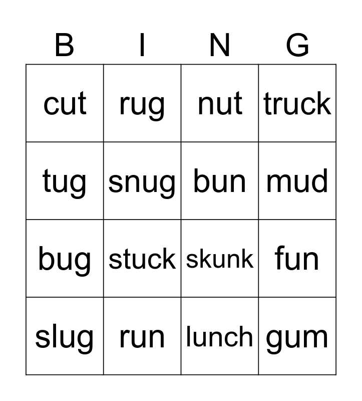 This bingo card has 16 words: run, fun, nut, cut, bug, rug, skunk, lunch, tug, snug, slug, truck, stuck, mud, bun and gum.