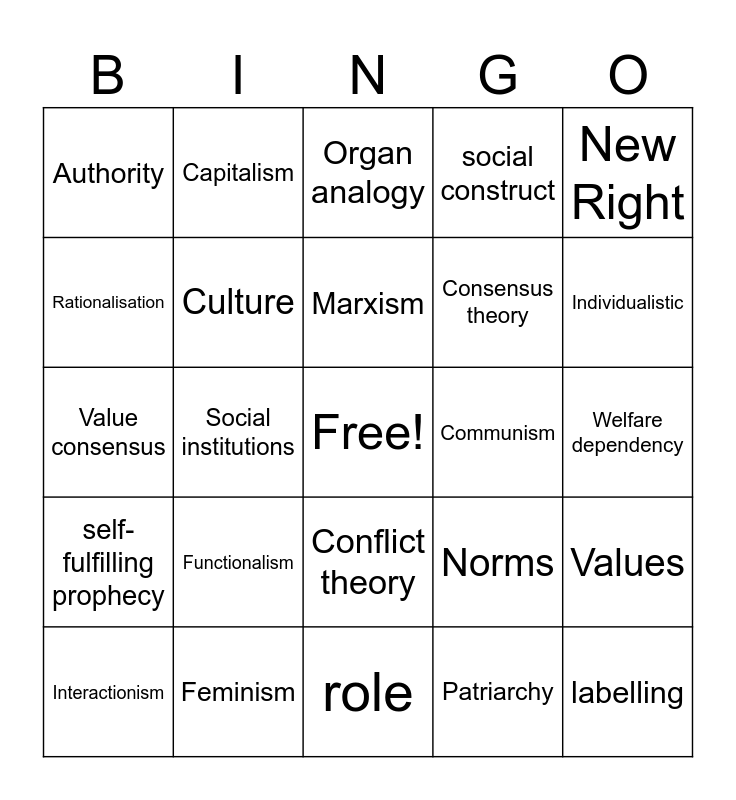 This bingo card has a free space and 24 words: Functionalism, Feminism, Marxism, Interactionism, New Right, Authority, Rationalisation, Capitalism, Communism, Conflict theory, Consensus theory, Value consensus, Norms, Values, Culture, Patriarchy, Welfare dependency, Organ analogy, Individualistic, Social institutions, labelling, self-fulfilling prophecy, social construct and role.