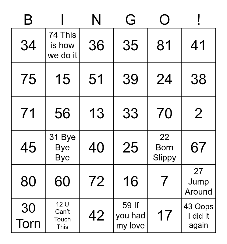 This bingo card has 91 words: Free!, 1 Wannabe, 2, 3, 4, 5 Bitter Sweet Symphony, 6, 7, 8 Waterfalls, 9, 10, 11, 12 U Can’t Touch This, 13, 14, 15, 16, 17, 18 Barbie Girl, 19, 20, 21, 22 Born Slippy, 23, 24, 25, 26, 27 Jump Around, 28, 29, 30 Torn, 31 Bye Bye Bye, 32, 33, 34, 35, 36, 37, 38, 39, 40, 41, 42, 43 Oops I did it again, 44, 45, 46, 47 I will always love you, 48, 49, 50, 51, 52, 53, 54, 55 Say my name, 56, 57, 58, 59 If you had my love, 60, 61, 62 Around the world, 63, 64, 65, 66, 67, 68, 69 C.R.E.A.M, 70, 71, 72, 73, 74 This is how we do it, 75, 76 Iris, 77, 78, 79, 80, 81, 82 Ready or not, 83, 84 Enter sandman, 85, 86, 87, 88, 89 and 90 Geenie in a bottle.