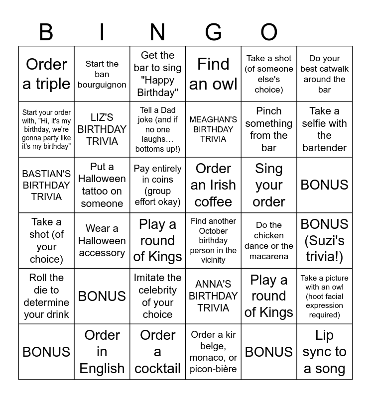 This bingo card has 36 words: ANNA'S BIRTHDAY TRIVIA, Imitate the celebrity of your choice, Order a kir belge, monaco, or picon-bière, Start your order with, "Hi, it's my birthday, we're gonna party like it's my birthday", Take a shot (of your choice), Order an Irish coffee, LIZ'S BIRTHDAY TRIVIA, Order a cocktail, Take a shot (of someone else's choice), Play a round of Kings, Take a selfie with the bartender, Find an owl, Take a picture with an owl (hoot facial expression required), Put a Halloween tattoo on someone, MEAGHAN'S BIRTHDAY TRIVIA, Order a triple, Roll the die to determine your drink, Sing your order, BASTIAN'S BIRTHDAY TRIVIA, Get the bar to sing "Happy Birthday", Pay entirely in coins (group effort okay), Wear a Halloween accessory, Find another October birthday person in the vicinity, Play a round of Kings, Do the chicken dance or the macarena, Start the ban bourguignon, Pinch something from the bar, Order in English, Tell a Dad joke (and if no one laughs…bottoms up!), Do your best catwalk around the bar, Lip sync to a song, BONUS, BONUS (Suzi's trivia!), BONUS, BONUS and BONUS.
