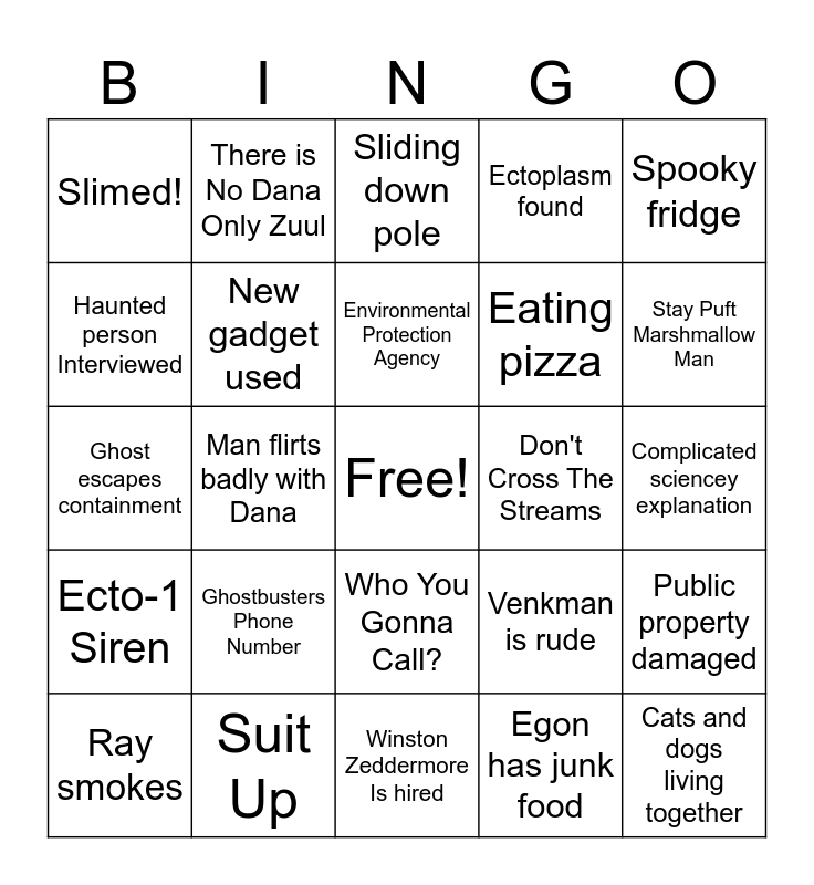 This bingo card has a free space and 24 words: Ghostbusters Phone Number, Suit Up, Environmental Protection Agency, Ray smokes, Spooky fridge, Slimed!, Haunted person Interviewed, There is No Dana Only Zuul, Don't Cross The Streams, Who You Gonna Call?, Eating pizza, Ghost escapes containment, Venkman is rude, Public property damaged, New gadget used, Egon has junk food, Complicated sciencey explanation, Sliding down pole, Stay Puft Marshmallow Man, Man flirts badly with Dana, Cats and dogs living together, Ecto-1 Siren, Ectoplasm found and Winston Zeddermore Is hired.