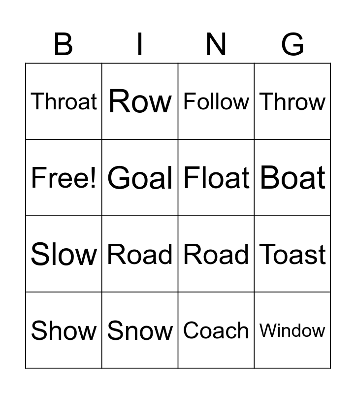 This bingo card has 16 words: Snow, Toast, Follow, Throat, Slow, Row, Road, Coach, Free!, Goal, Show, Throw, Road, Boat, Float and Window.
