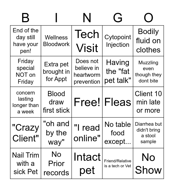 This bingo card has a free space and 29 words: Nail Trim with a sick Pet, AG's, Blood draw first stick, All rooms full, End of the day still have your pen!, Tech Visit, Extra pet brought in for Appt, "oh and by the way", Fleas, No Prior records, Client 10 min late or more, No Show, Intact pet, Friend/Relative is a tech or Vet, Muzzling even though they dont bite, Rabies only, "I read online", "Crazy Client", Bodily fluid on clothes, concern lasting longer than a week, No table food except..., Cleaning up urine/stool on floor from pt, Having the "fat pet talk", Friday special NOT on Friday, Cytopoint Injection, Wellness Bloodwork, Diarrhea but didn't bring a stool sample, Does not believe in heartworm prevention and Grumpy pet.