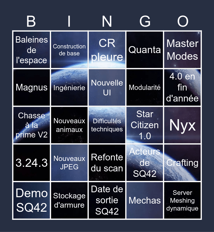 This bingo card has 24 images, a free space and 24 words: Demo SQ42, Nouveaux JPEG, Nouvelle UI, Mechas, Master Modes, Baleines de l'espace, Construction de base, CR pleure, Star Citizen 1.0, Nyx, Chasse à la prime V2, Ingénierie, Acteurs de SQ42, Crafting, Magnus, Stockage d'armure, Date de sortie SQ42, Quanta, 4.0 en fin d'année, 3.24.3, Nouveaux animaux, Refonte du scan, Modularité and Server Meshing dynamique.