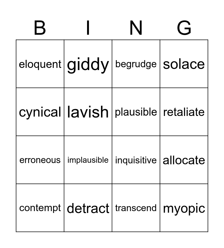 This bingo card has 20 words: allocate, apathetic, begrudge, composite, contempt, cynical, detract, eloquent, erroneous, giddy, implausible, inquisitive, lavish, myopic, plausible, reconciliation, retaliate, solace, transcend and vivacious.