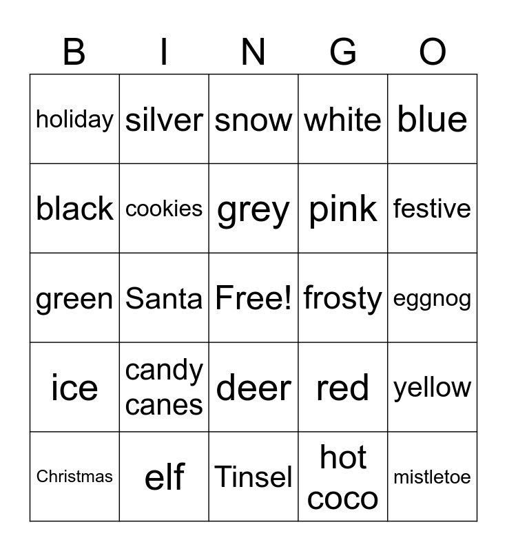 This bingo card has a free space and 29 words: Christmas, winter, Santa, Rudolph, holiday, snow, cookies, candy canes, frosty, elf, eggnog, mistletoe, Tinsel, hot coco, festive, ornaments, deer, ice, blue, green, red, orange, pink, black, white, silver, yellow, grey and gold.