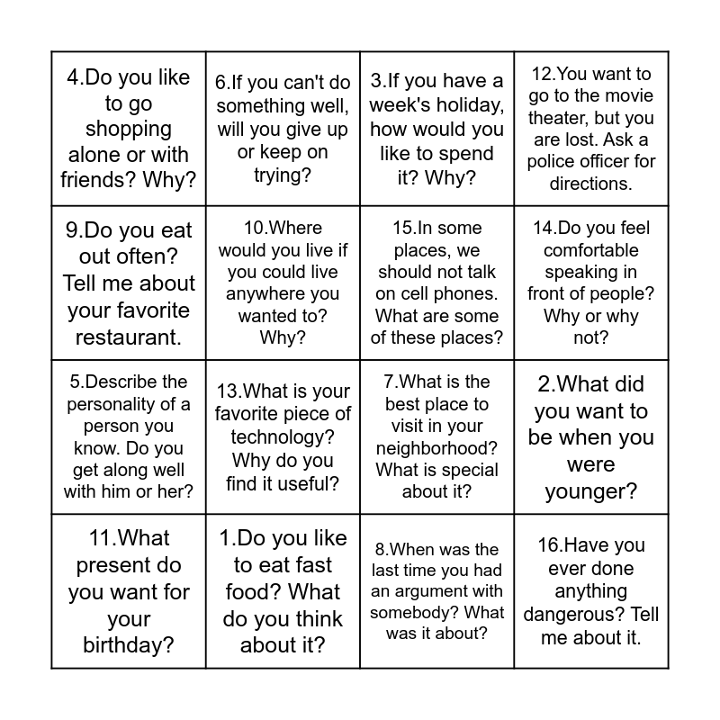This bingo card has 16 words: 1.Do you like to eat fast food? What do you think about it?, 2.What did you want to be when you were younger?, 3.If you have a week's holiday, how would you like to spend it? Why?, 4.Do you like to go shopping alone or with friends? Why?, 5.Describe the personality of a person you know. Do you get along well with him or her?, 6.If you can't do something well, will you give up or keep on trying?, 7.What is the best place to visit in your neighborhood? What is special about it?, 8.When was the last time you had an argument with somebody? What was it about?, 9.Do you eat out often? Tell me about your favorite restaurant., 10.Where would you live if you could live anywhere you wanted to? Why?, 11.What present do you want for your birthday?, 12.You want to go to the movie theater, but you are lost. Ask a police officer for directions., 13.What is your favorite piece of technology? Why do you find it useful?, 14.Do you feel comfortable speaking in front of people? Why or why not?, 15.In some places, we should not talk on cell phones. What are some of these places? and 16.Have you ever done anything dangerous? Tell me about it..
