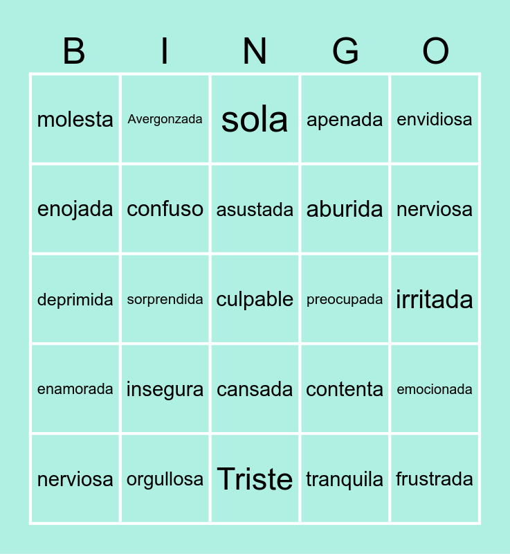 This bingo card has 25 words: insegura, Triste, asustada, nerviosa, envidiosa, molesta, enojada, Avergonzada, preocupada, cansada, aburida, deprimida, contenta, emocionada, confuso, frustrada, irritada, sola, nerviosa, sorprendida, culpable, orgullosa, enamorada, apenada and tranquila.