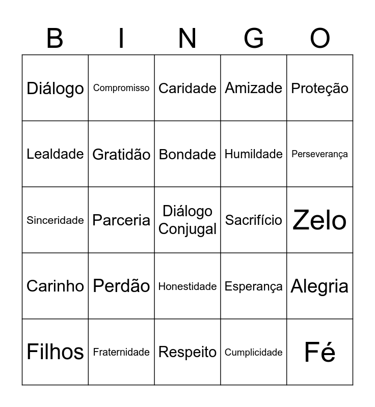 This bingo card has a free space and 50 words: Amor, Fé, Paz, Respeito, Perdão, Confiança, Compromisso, Comunicação, Lealdade, Aliança, Gratidão, Amizade, Alegria, Esperança, Paciência, Generosidade, Bondade, Sacrifício, União, Proteção, Parceria, Cumplicidade, Diálogo, Humildade, Fidelidade, Oração, Perseverança, Felicidade, Caridade, Honestidade, Família, Amparo, Sabedoria, Paz de espírito, Fraternidade, Solidariedade, Tolerância, Auxílio, Dedicação, Zelo, Espírito Santo, Vocação, Harmonia, Lar, Filhos, Sinceridade, Compreensão, Acolhimento, Carinho and Apoio.