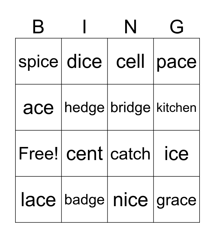 This bingo card has 20 words: ice, face, cell, rice, lace, ace, badge, spice, Free!, dice, cent, catch, hedge, grace, bridge, price, kitchen, pace, nice and brace.