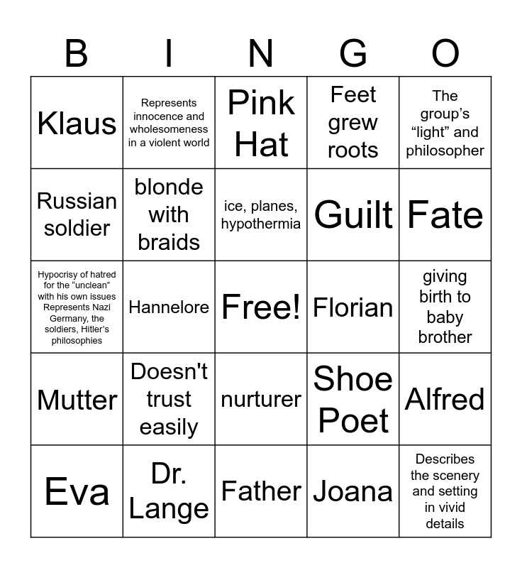 This bingo card has a free space and 35 words: bathroom stall, box, key, map, swan, philosopher, blonde with braids, nurturer, Feet grew roots, Russian soldier, German soldier, ice, planes, hypothermia, Reads people, their thoughts and emotions, Hypocrisy of hatred for the “unclean” with his own issues Represents Nazi Germany, the soldiers, Hitler’s philosophies, The group’s “light” and philosopher, The voice of hope, reason, and connecting everyone, Emilia, Klaus, Florian, Joana, Hannelore, Mutter, Describes the scenery and setting in vivid details, Shoe Poet, Eva, Alfred, Dr. Lange, Pink Hat, Fate, Shame, Fear, Guilt, giving birth to baby brother, Mother, Father, Doesn't trust easily, Represents innocence and wholesomeness in a violent world and Book Mein Kampf.