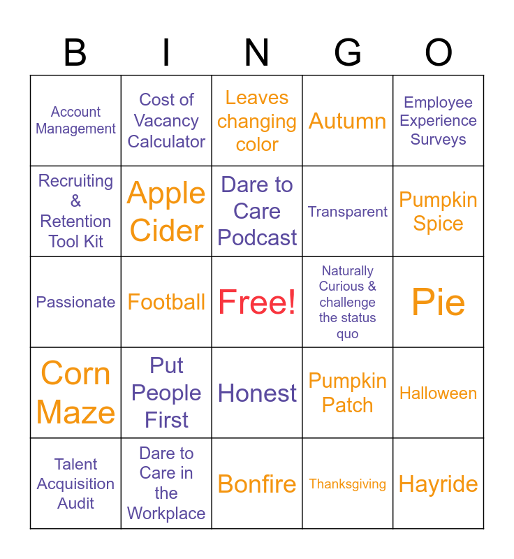 This bingo card has a free space and 24 words: Put People First, Dare to Care in the Workplace, Dare to Care Podcast, Talent Acquisition Audit, Employee Experience Surveys, Account Management, Recruiting & Retention Tool Kit, Cost of Vacancy Calculator, Naturally Curious & challenge the status quo, Honest, Transparent, Passionate, Pumpkin Patch, Halloween, Apple Cider, Thanksgiving, Pie, Leaves changing color, Pumpkin Spice, Football, Hayride, Corn Maze, Autumn and Bonfire.