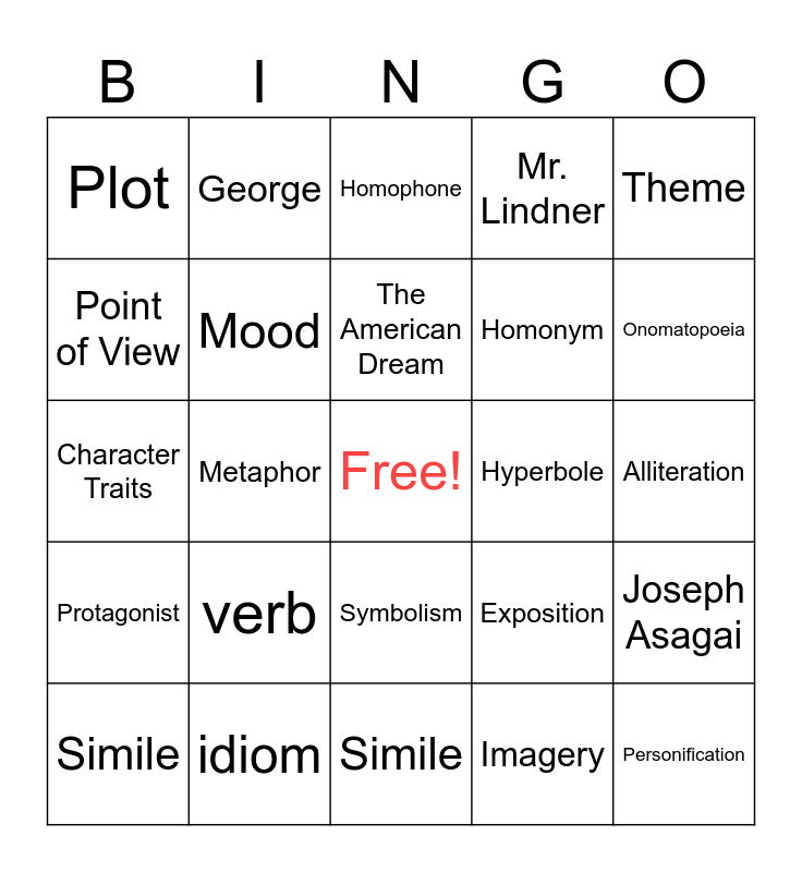 This bingo card has a free space and 29 words: Simile, Antagonist, Metaphor, adjective, Plot, Homophone, Mood, verb, Hyperbole, idiom, Alliteration, Personification, Simile, Imagery, Onomatopoeia, noun, Symbolism, Protagonist, Theme, Character Traits, Exposition, Stop and Shop, Homonym, Point of View, Mr. Lindner, George, Joseph Asagai, The American Dream and Lorraine Hansberry.