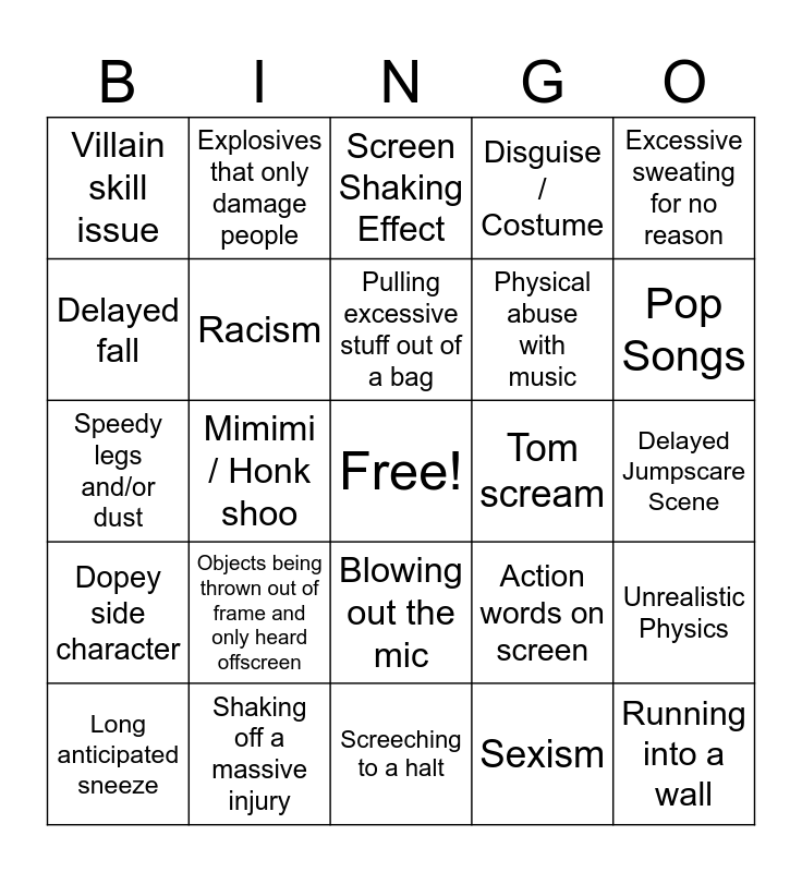 This bingo card has a free space and 24 words: Objects being thrown out of frame and only heard offscreen, Shaking off a massive injury, Pulling excessive stuff out of a bag, Long anticipated sneeze, Excessive sweating for no reason, Villain skill issue, Delayed fall, Explosives that only damage people, Tom scream, Blowing out the mic, Physical abuse with music, Speedy legs and/or dust, Action words on screen, Unrealistic Physics, Racism, Sexism, Delayed Jumpscare Scene, Screen Shaking Effect, Pop Songs, Mimimi / Honk shoo, Running into a wall, Dopey side character, Disguise / Costume and Screeching to a halt.