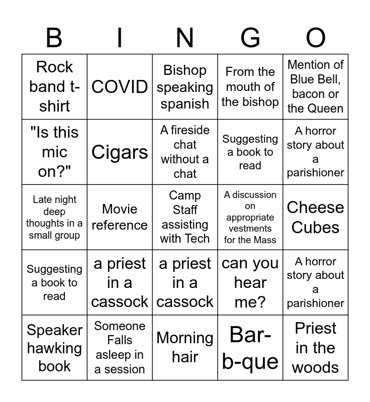 This bingo card has 82 words: Malapropism From the mouth of the bishop, Chuck with a guitar around the fire pit, Bishop speaking spanish, Goldfish, COVID, Plaid Shirt, A fireside chat without a chat, A question that's more of a comment, Clergy Pictorial Directory, A clergy Collar, Cheese Cubes, Someone Falls asleep in a session, Cigars, A discussion on appropriate vestments for the Mass, Someone calling a bishop “your grace”, Rock band t-shirt, Speaker hawking book, "Is this mic on?", can you hear me?, water bottles left under chair, Name dropping, Suggesting a book to read, Camp Staff assisting with Tech, Mention of Blue Bell, bacon or the Queen, Movie reference, Canon Faulstich makes a correction, A maniple, non Aggie in overalls, "Where is that?", spelling mistake in a ppt slide, a priest in a cassock, Bar-b-que, Late night deep thoughts in a small group, Priest in the woods, Deacon hanging out, Morning hair, Boomers drinking coffee in the morning, An old EDOT story about a bishop, A horror story about a parishioner, Loud laughter, Malapropism, From the mouth of the bishop, Chuck with a guitar around the fire pit, Bishop speaking Spanish, Goldfish, COVID, Plaid Shirt, A fireside chat without a chat, A question that's more of a comment, Clergy Pictorial Directory, A clergy Collar, Cheese Cubes, Someone Falls asleep in a session, Cigars, A discussion on appropriate vestments for the Mass, Someone calling a bishop “your grace”, Rock band t-shirt, Speaker hawking book, "Is this mic on?", can you hear me?, water bottle left under chair, Name dropping, Suggesting a book to read, Camp Staff assisting with Tech, Mention of Blue Bell, bacon, Movie reference, Canon Faulstich makes a correction, A maniple, non Aggie in overalls, "Where is that?", spelling mistake in a ppt slide, a priest in a cassock, Bar-b-que, Late-night deep thoughts in a small group, Priest in the woods, Deacon hanging out, Morning hair, Boomers drinking coffee in the morning, An old EDOT story about a bishop, A horror story about a parishioner and Loud laughter.