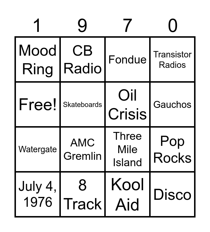 This bingo card has 16 words: 8 Track, Pop Rocks, Fondue, Mood Ring, Watergate, CB Radio, Three Mile Island, Kool Aid, Free!, Skateboards, July 4, 1976, Transistor Radios, AMC Gremlin, Gauchos, Oil Crisis and Disco.