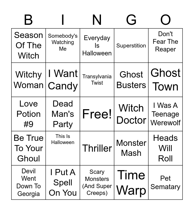 This bingo card has a free space and 24 words: This Is Halloween, I Put A Spell On You, Transylvania Twist, Devil Went Down To Georgia, Don't Fear The Reaper, Season Of The Witch, Witchy Woman, Somebody's Watching Me, Witch Doctor, Thriller, Ghost Busters, Love Potion #9, Monster Mash, Heads Will Roll, I Want Candy, Time Warp, I Was A Teenage Werewolf, Everyday Is Halloween, Ghost Town, Dead Man's Party, Pet Sematary, Be True To Your Ghoul, Superstition and Scary Monsters (And Super Creeps).